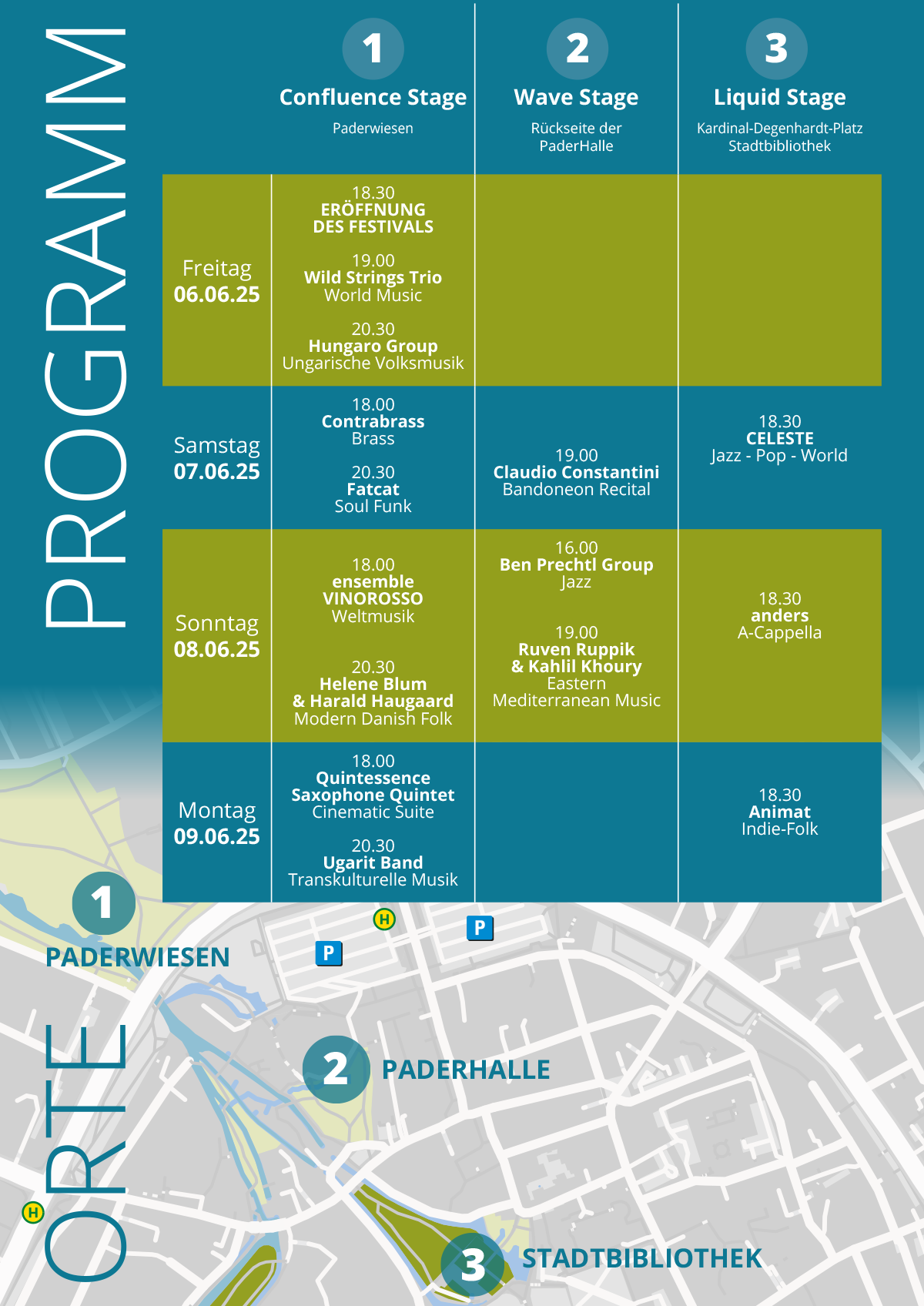 Pfingsten 2023 feierte ein neues Event seine Premiere: Confluence – das Pader Musik Festival. Unter der künstlerischen Leitung von Uli Lettermann traten auf drei Bühnen im Paderquellgebiet und auf dem Kardinal-Degenhardt-Platz vor der Stadtbibliothek an vier Tagen insgesamt 16 Ensembles auf – Open Air und bei freiem Eintritt.